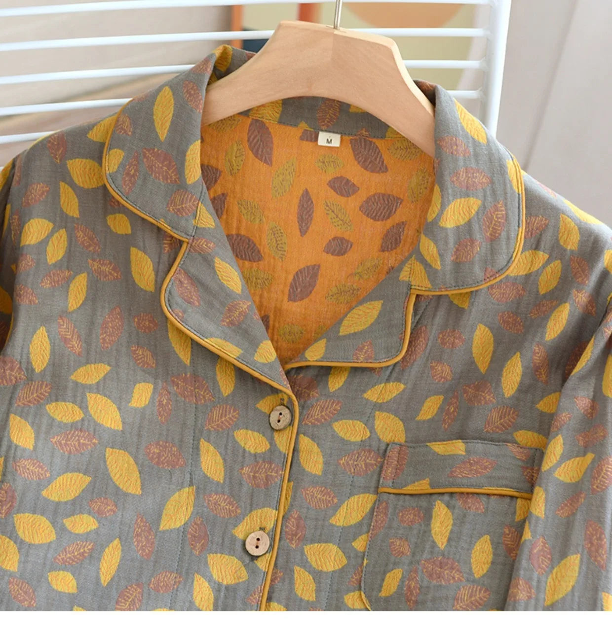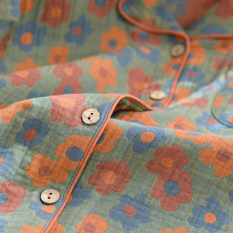 Pyjama Femme en Coton Gaufré – Ensemble Estival à Manches Longues Imprimé Floral
