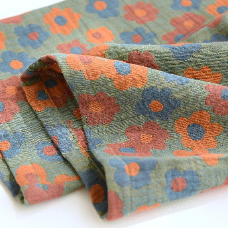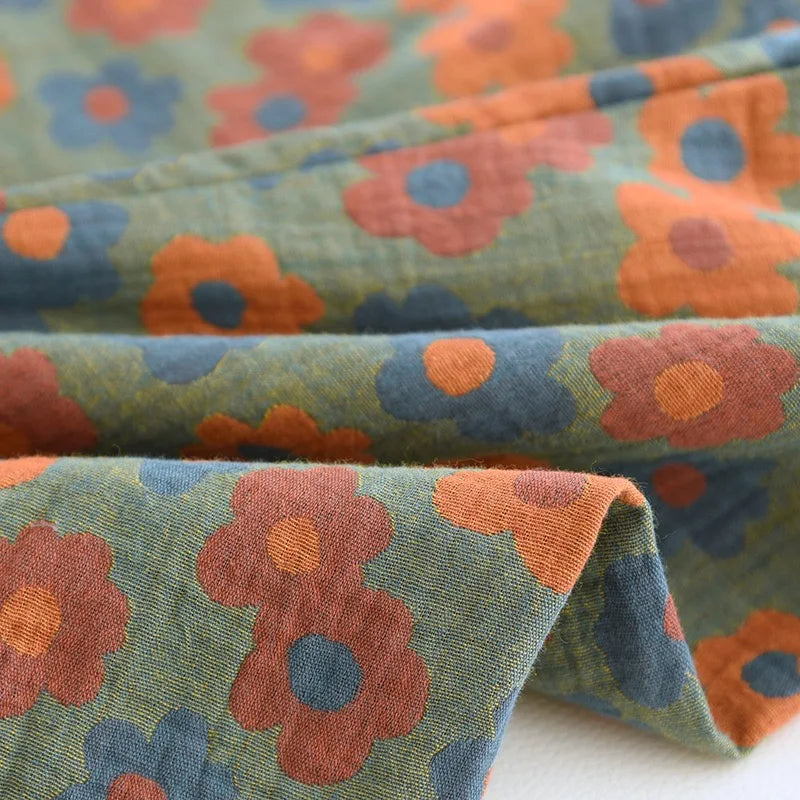 imprimé floral vibrant aux teintes organiques (ocre, vert mousse, bleu grisé, rouille), parfait pour l’été comme pour la mi-saison.
