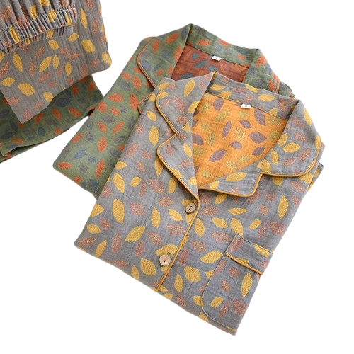 coupe ample fluide, col tailleur classique, manches longues – un pyjama floral qui allie tradition textile et modernité.