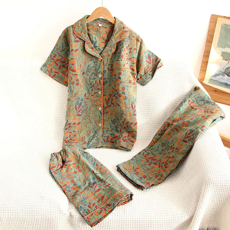 Pyjama Femme en Coton Gaufré – Ensemble Estival à Manches Longues Imprimé Floral
